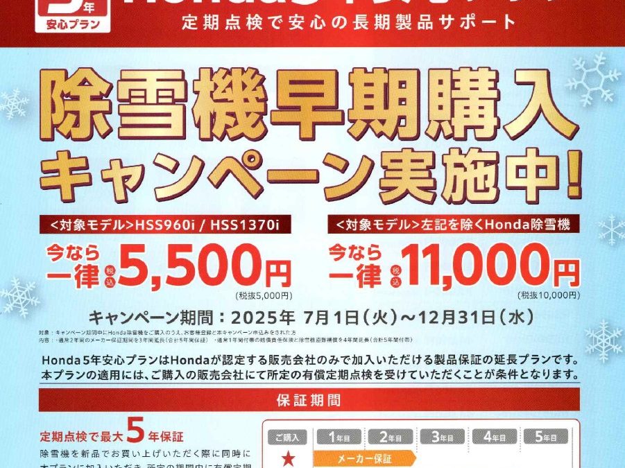 - 今なら一律11,000円(税抜き10,000円)<対象モデル>HSS960i/HSS1370iを除くHonda除雪機